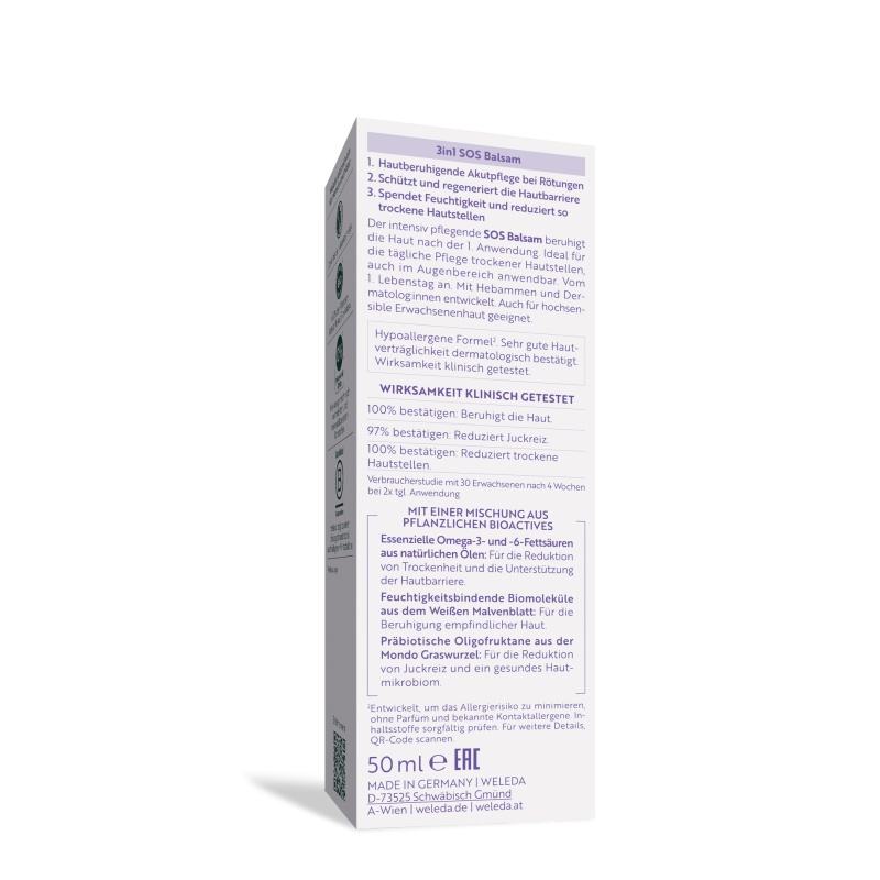 Weleda Valge Kassinaerise 3 in1 SOS palsam pakub õrna ja tõhusat hooldust eriti tundlikule, kuivale ja atoopilisele nahale ning rahustab nahka juba esimesel kasutuskorral. See rahustav kreem on spetsiaalselt välja töötatud väga tundlikule ja kuivale nahale, vähendab naha kuivust ja punetust ning pakub kohest leevendust sügelevatele ja kuivadele laikudele. Ohutu kasutada alates esimesest elupäevast.